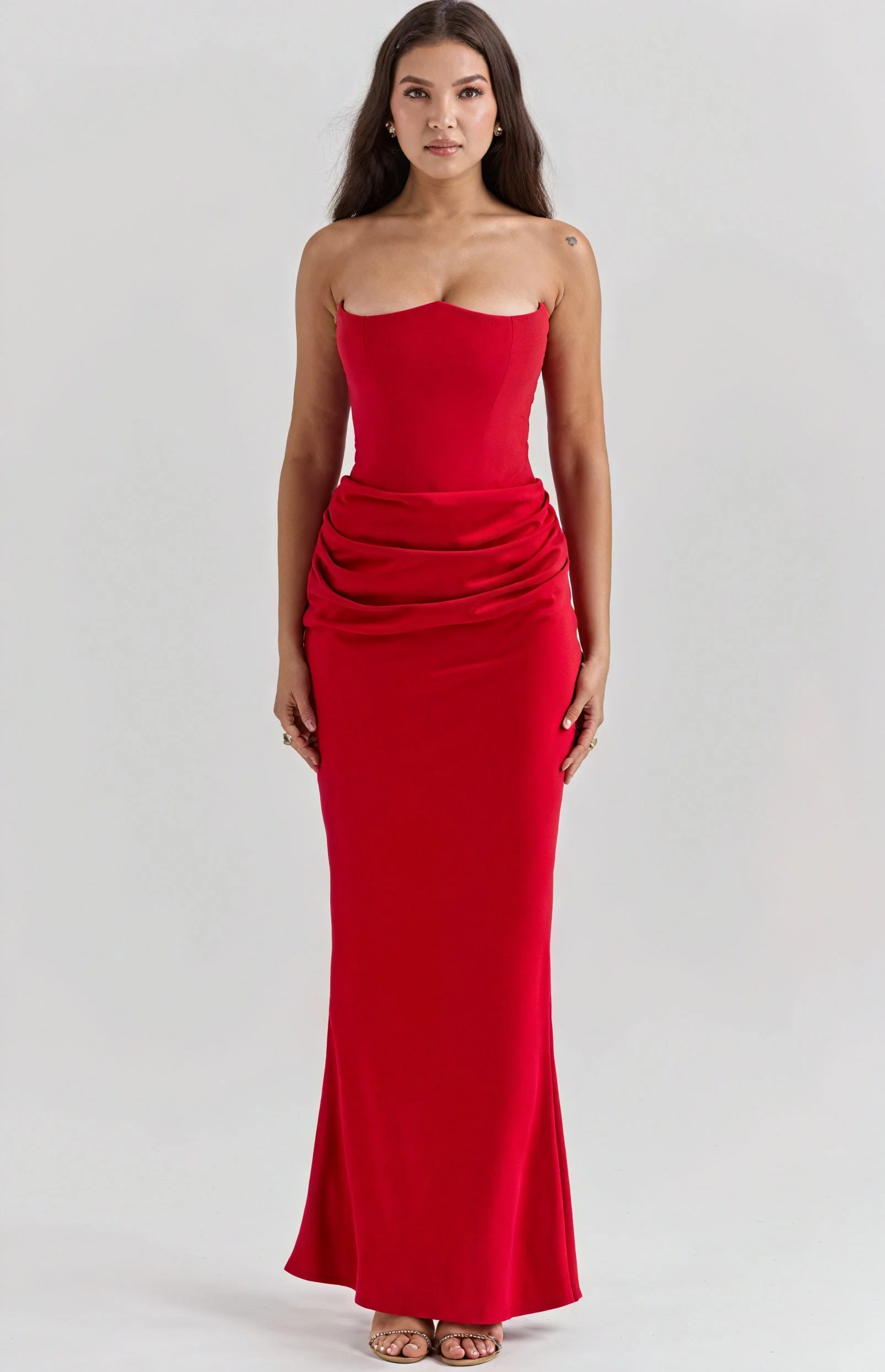 Scopri un abito che celebra la silhouette femminile con un design strapless che mette in risalto le curve. Realizzato con materiali di alta qualità, questo capo offre comfort e libertà di movimento, rendendolo ideale per eventi indimenticabili. La sua struttura aderente e il drappeggio in vita creano un effetto affascinante, perfetto per ogni occasione.